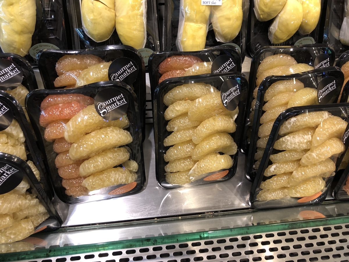 gourmet marketは、パラゴンなどのショッピングモール地下にある高級スーパーです。お土産を買うにも重宝します。結構良いお値段(5〜600円くらい)はしますが、お気に入りはこちらのポメロ(日本語では文旦やザボン)です。皮が全てむいてあるので、すごく食べやすい。見た感じグレープフルーツみたいなオレンジ色の方が美味しそうに見えるが、味は黄色の方が断然美味しいので見た目に騙されず全部黄色のを選びましょう。