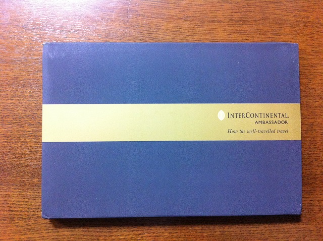 2012-06-21 Intercontinental Ambassador キット その他 #練習用 5月下旬にポチっとしていた、インターコンチネンタルのゴールドアンバサダーキットがようやく届きましたとさ。 他のブログ記事などで見ているキットよりも、相当薄っぺらい箱で、しかもショボいです・・・ 用は、カードと週末無料宿泊券、それからおまけのネームタグだけでいいのですが、わざわざベルギーから送られてきましたとさ それよりも、デルタゴールドメダリオンカードの方、はやく届かんかな
